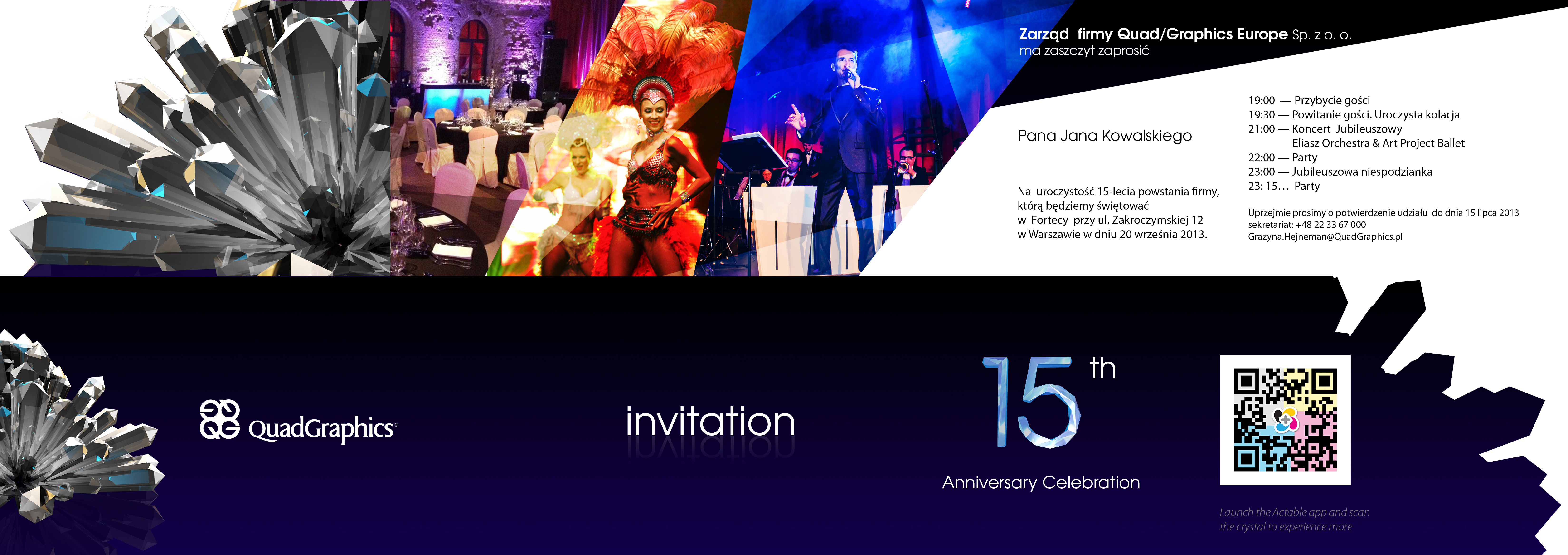 Opracowanie i projekt digitalowej i multimedialnej formy zaproszenia na imprezę jubileuszową 15-lecia firmy Quad Graphics.